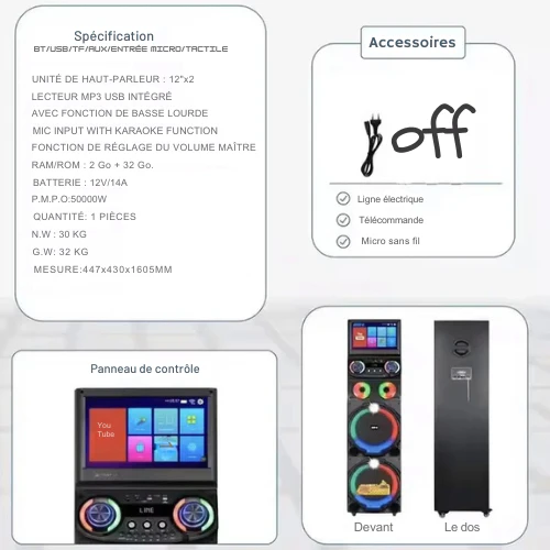 - Haut-parleurs : Double woofer 12” haute performance